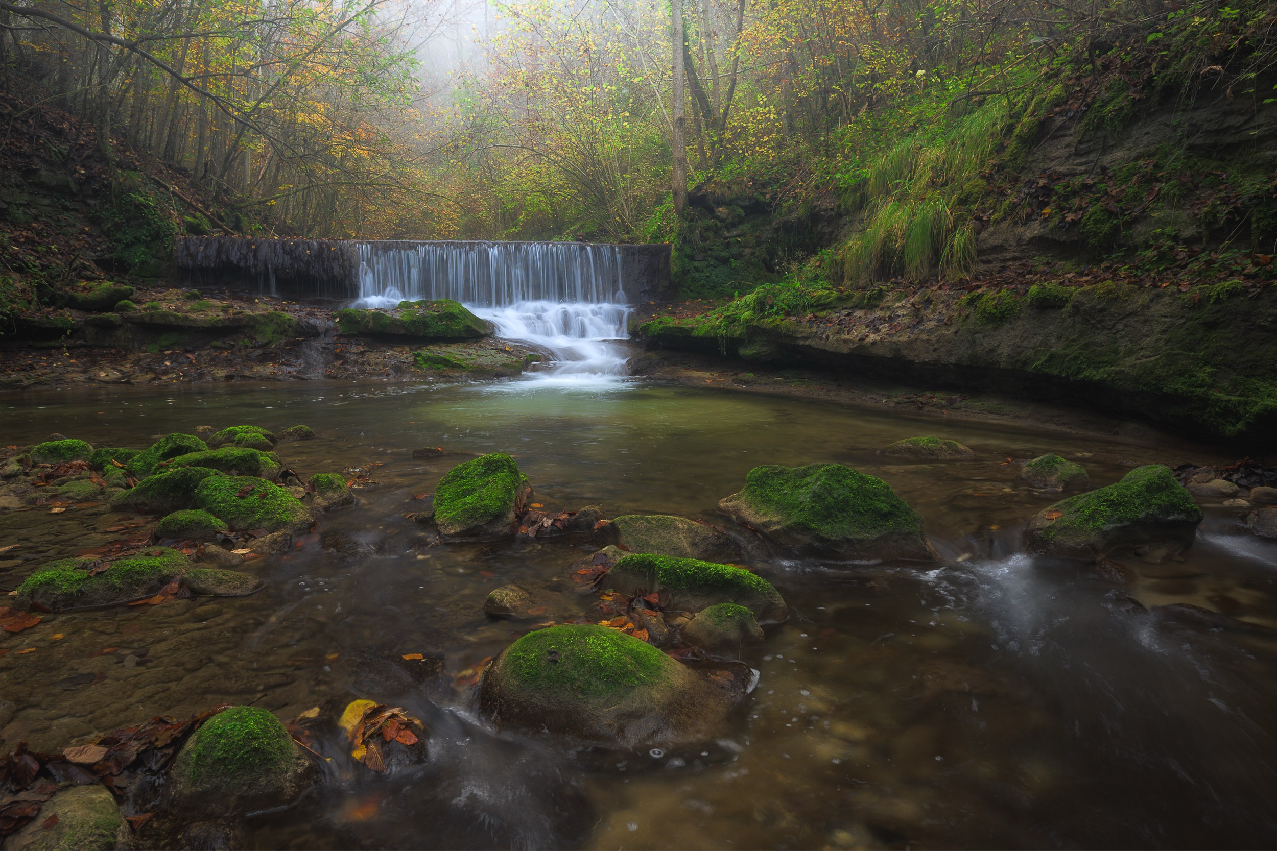 - Waterfall Drama: Cascading water with autumn colors